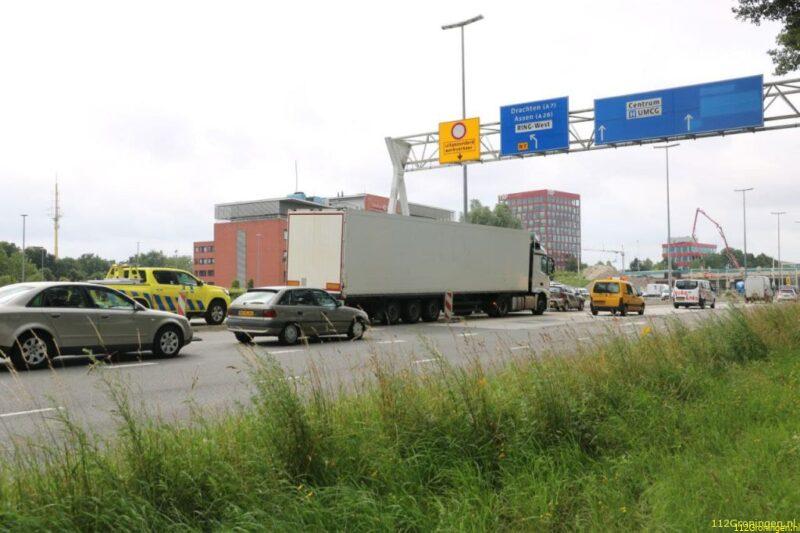 Door een aanrijding tussen een auto en een vrachtwagen liep het verkeer op de Oude