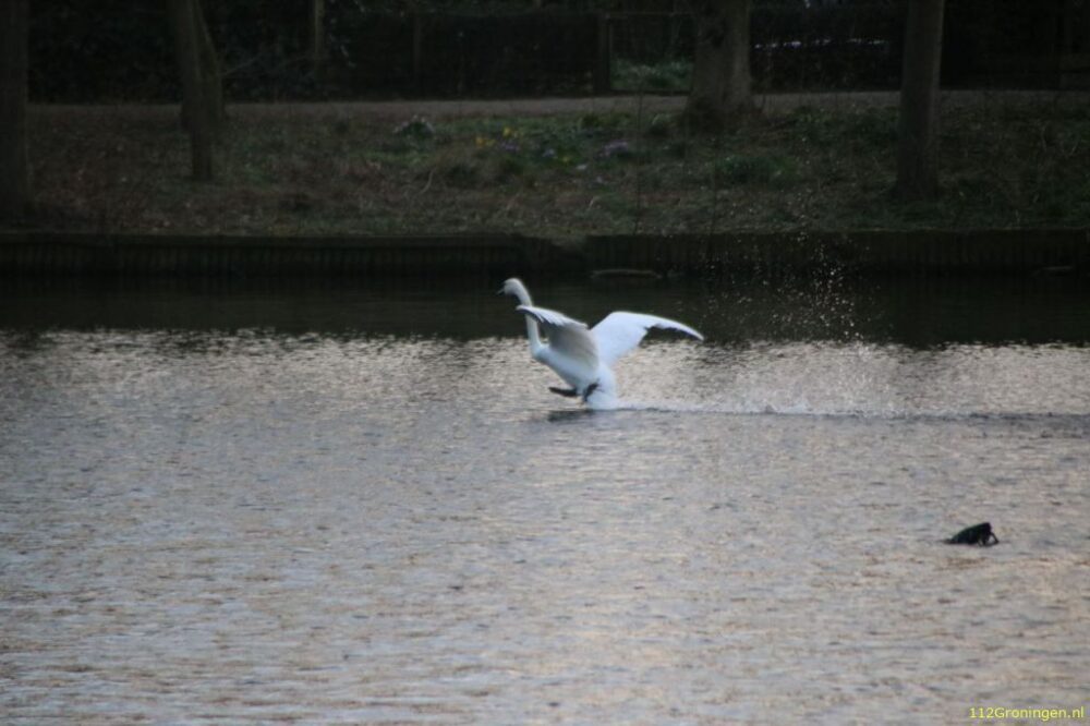 Zwaan met visdraad om poot en vleugels is hulpverleners te snel af