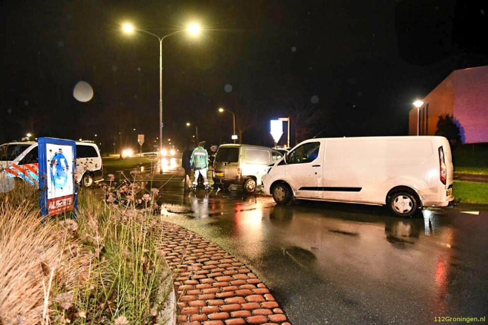 Bedrijfsbusje en personenauto botsen op rotonde in Roden, één persoon licht gewond