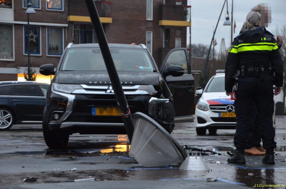 Automobilist ramt lantaarnpaal midden in centrum Veendam