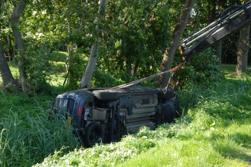 Bij een eenzijdig ongeval is dinsdagmiddag een auto over de kop geslagen. Een grote balk