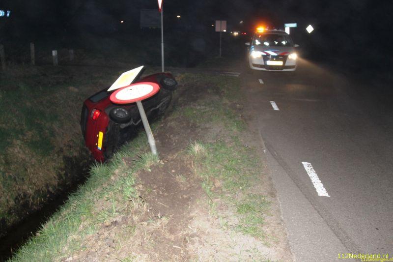 Zaterdagavond reed een auto over een verkeersbord de sloot in.