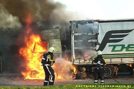Vrachtauto verwoest op A7 bij Scheemda+paalzitten
