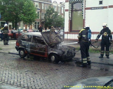 Groningen – Een autobrand in de Johan de Witstraat woensdagmiddag. Er bleef weinig over van