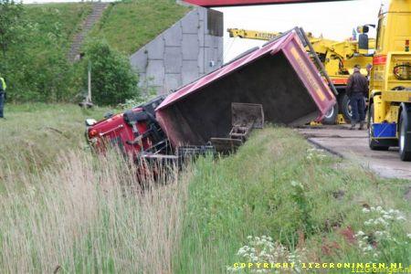 Stadskanaal – Een vrachtwagen is vrijdag middag in de slip geraakt en vervolgens gekanteld in