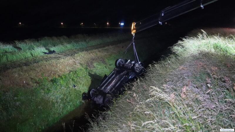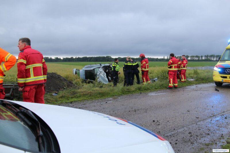 Auto belandt op zijkant aan de Nieuwlandseweg in Bellingwolde