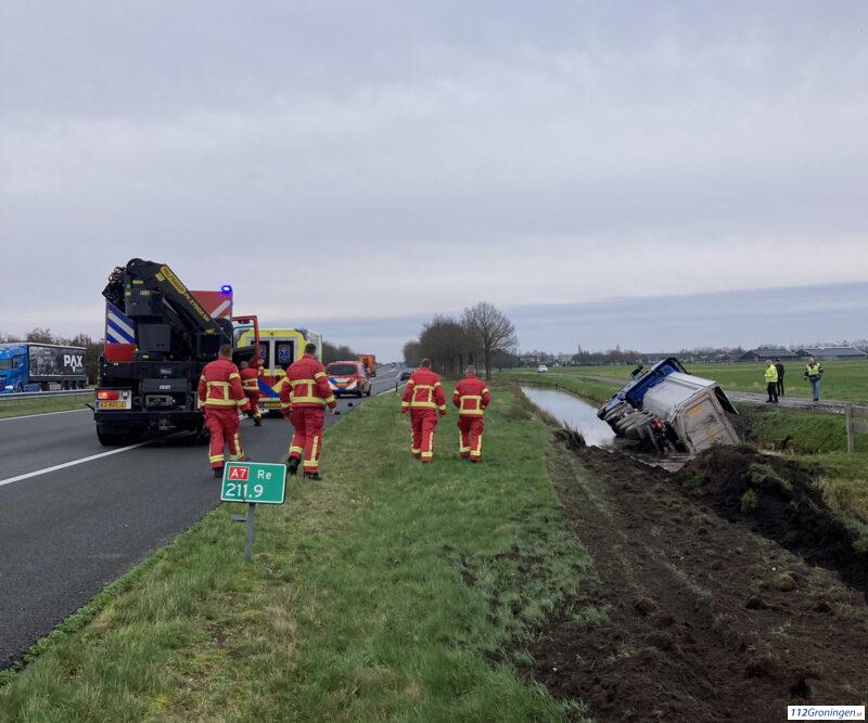 Vrachtwagen op de kant bij de Reidewolderpolder, chauffeur gewond