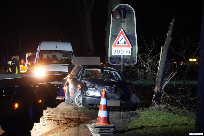 Auto bots tegen boom aan de Hoofdweg in Wedde