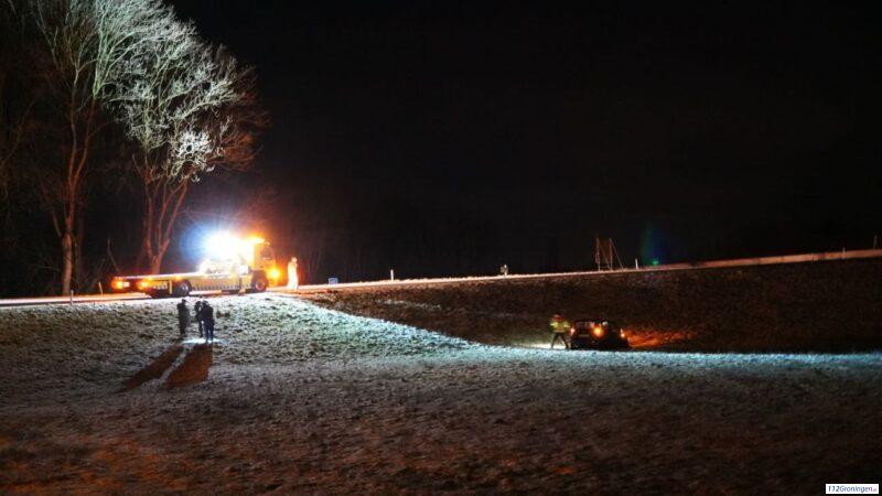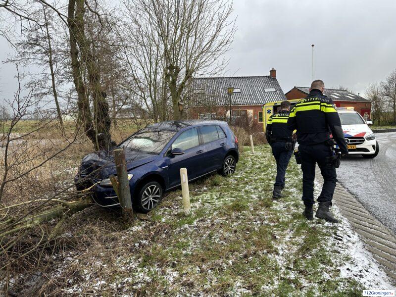 Auto raakt van de weg door spekglad wegdek Woldijk Bedum