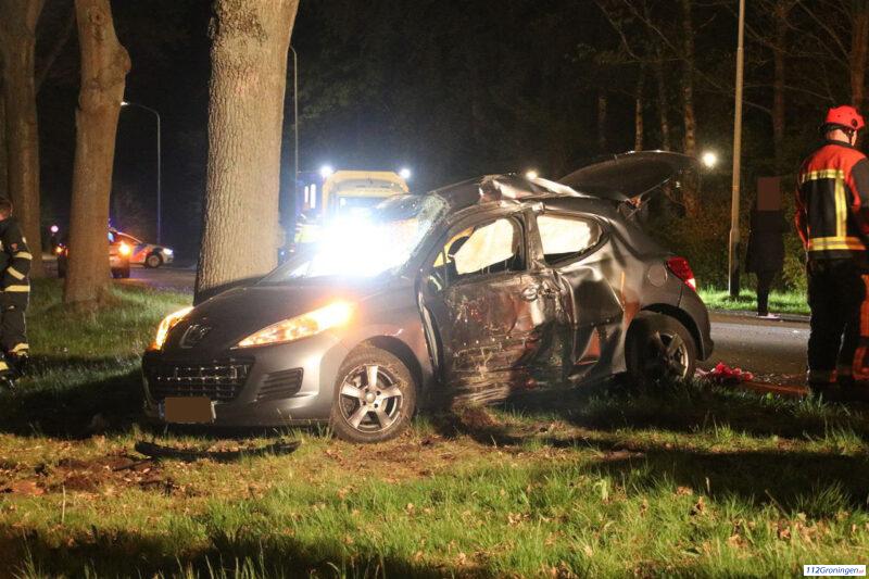 Auto tegen boom in Veendam, man(19) gewond (Video)
