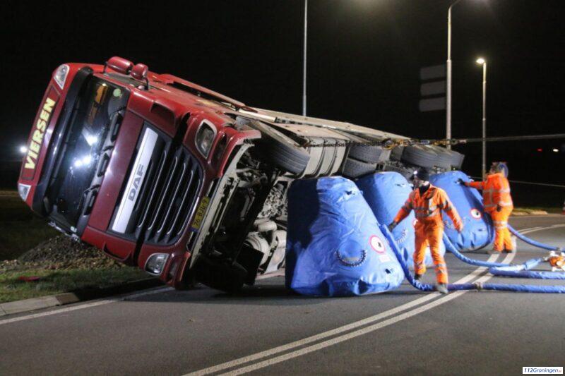 Vrachtwagen vol aardappelen kantelt op de N366 bij Veendam (Video)