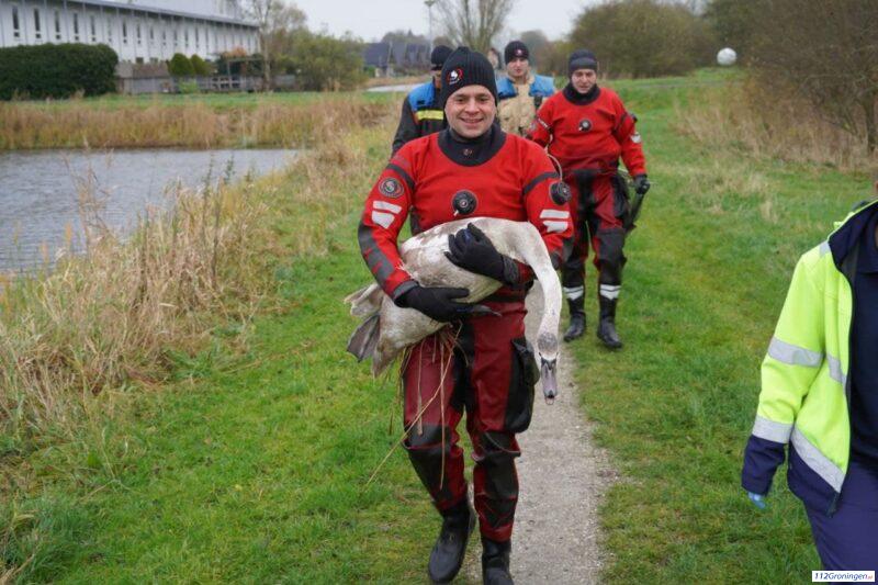 Brandweer en dierenambulance in actie voor jonge zwaan met ontstoken poot (Video)