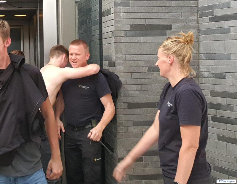 Brandweerman in Groningen wordt geknuffeld door blije jongeren die gered worden uit lift