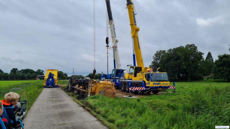 Een vrachtwagen is gisteren, dinsdagmiddag, op zijn kant in de sloot belandt langs de Olingerweg