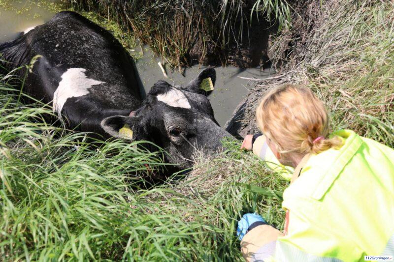 Aan de Westerlaan in Wagenborgen is donderdagmiddag een koe te water geraakt. De brandweer van