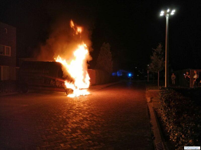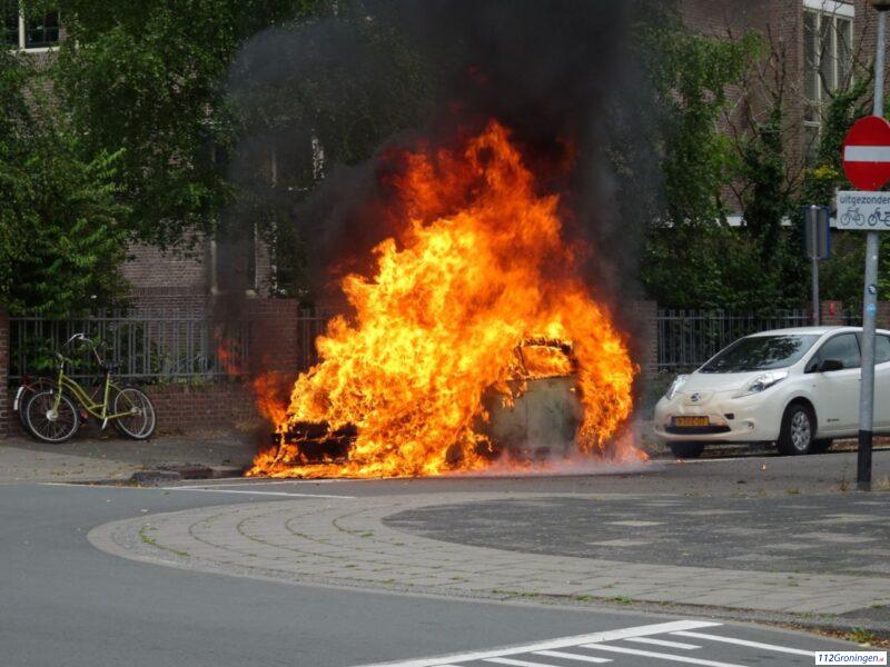 Een elektrische personenauto is zaterdagochtend volledig uitgebrand aan de Coendersweg in Helpman-Oost in Groningen. De