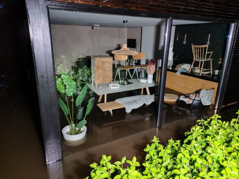 Wateroverlast na hevige regenbui, cavia`s zwemmen