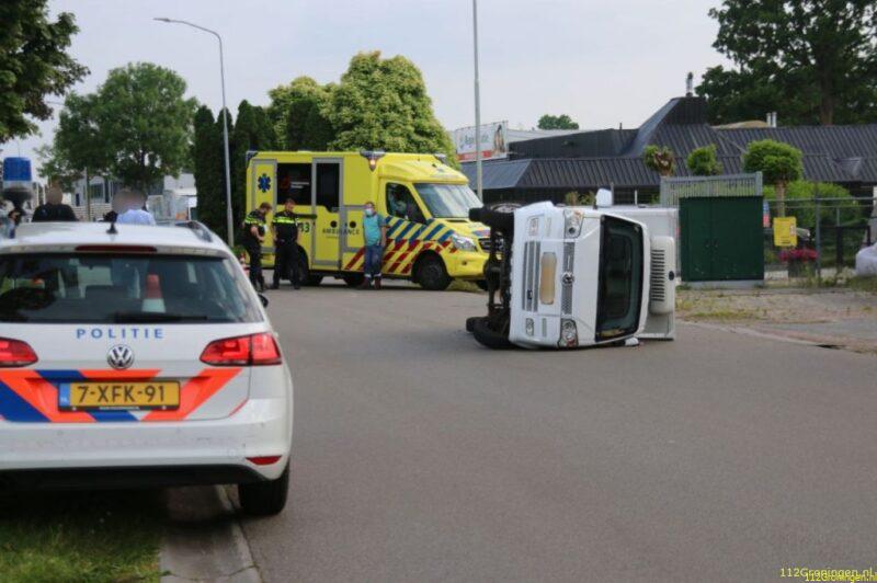 Bedrijfswagen belandt op zijkant bij ongeval in Veendam