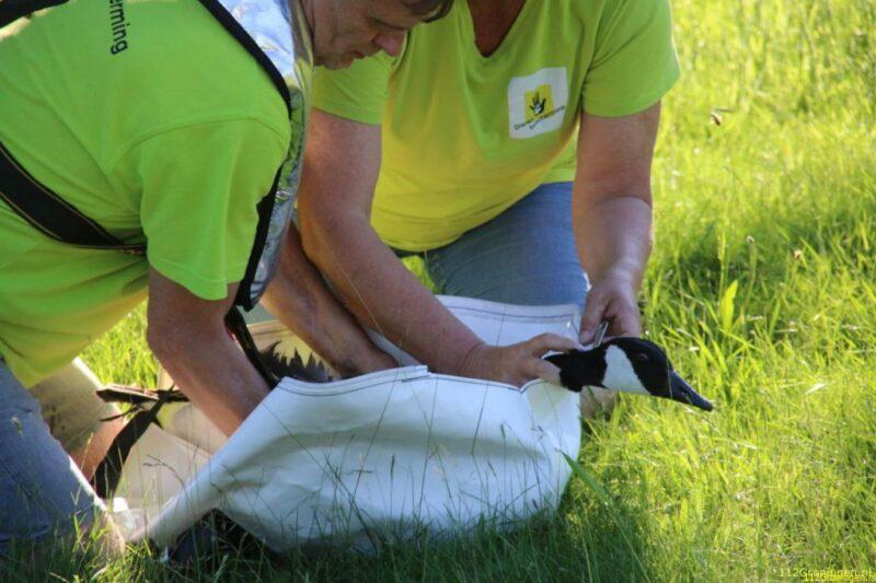 Brandweer en dierenambulance vangen Canadese gans met gebroken vleugel in Veendam