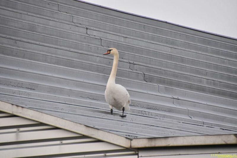 Zwaan vliegt tegen hoogspanningsmast en belandt op dak van sportcentrum Kardinge