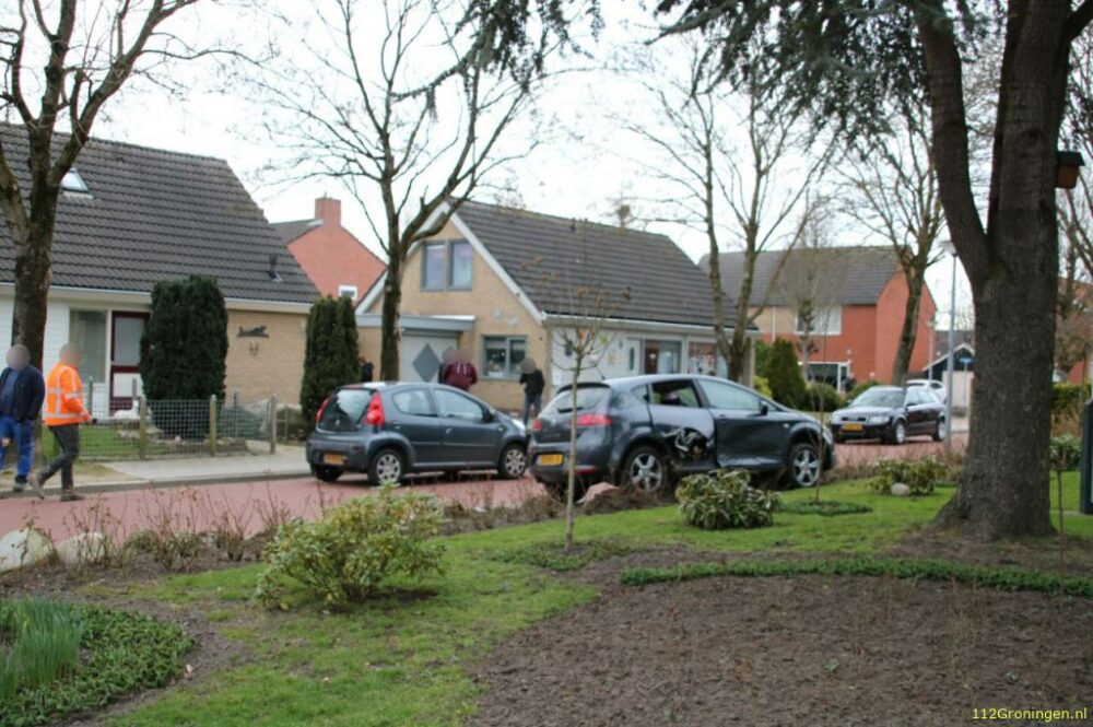 Automobilist belandt in voortuin na botsing met andere personenauto