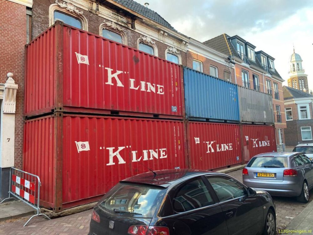 Gemeente plaatst zeecontainers voor panden in Winschoten vanwege mogelijk instortingsgevaar