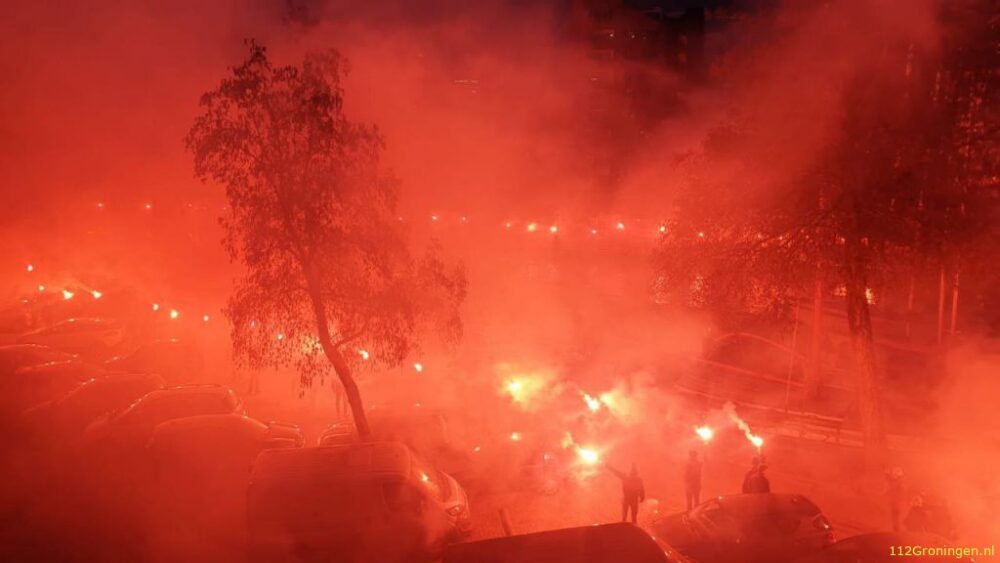 De Oosterhaven kleurde zaterdagavond rood door tientallen fakkels ontstoken door FC-supporters.
