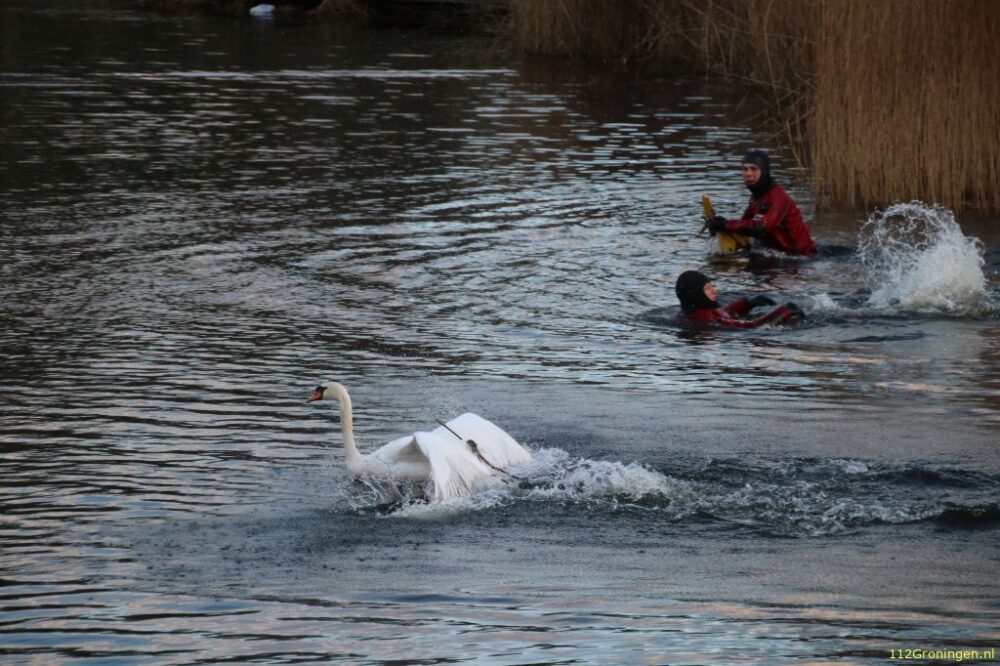 Brandweer in actie voor zwaan met stok tussen vleugel