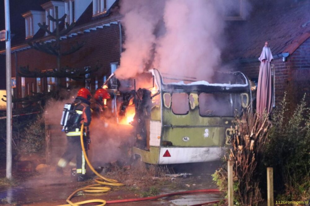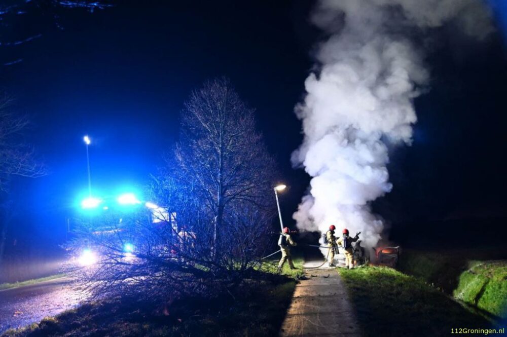 Op de Schoenerstraat in het Groningse dorp Hoogkerk is zaterdagavond een caravan compleet in vlammen