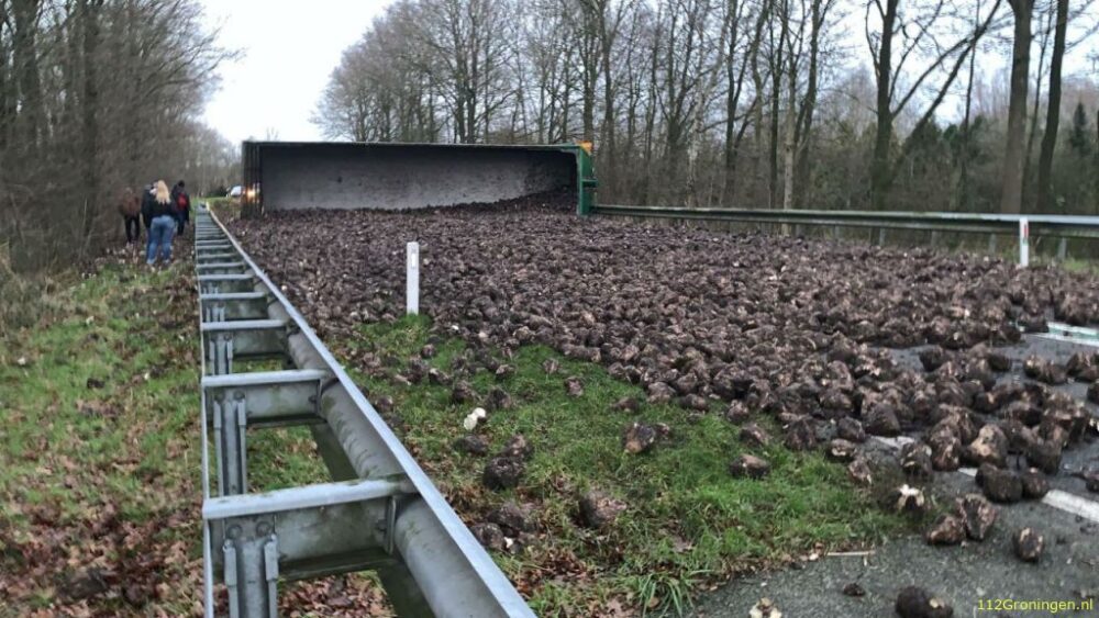 Zondagmiddag is een volgeladen bietenwagen, met enkele duizenden bieten, gekanteld op de Provincialeweg - N387