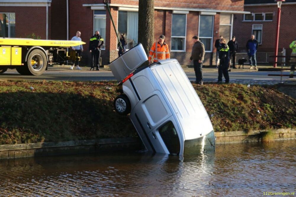 Auto rolt water in t.h.v. uitvaartcentrum Stadskanaal