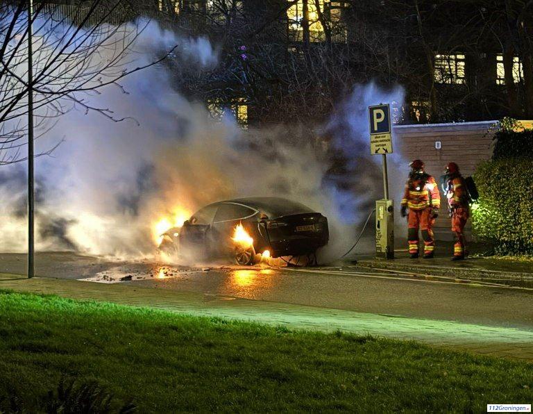 Groningen – Een elektrische auto heeft maandagavond vlam gevat op de Kornalijnlaan in de Stad.