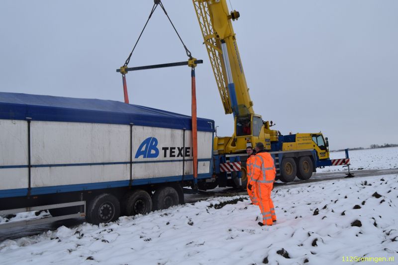Woensdagmorgen is op de Oosterburen nabij Huizinge een vrachtwagen van de weg gegleden.