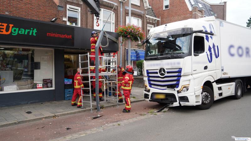 Vrachtwagenchauffeur botst tegen pilaar van winkel
