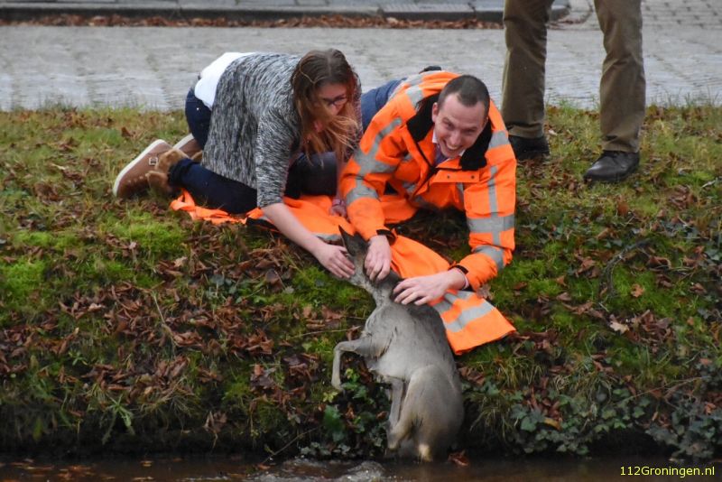Zondagmiddag zagen voorbijgangers een ree in het water zwemmen aan de Oosterstraat in Stadskanaal
