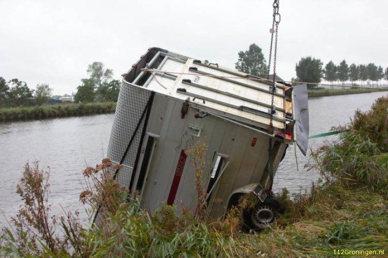 Door onbekende oorzaak is donderdagmiddag een auto met veetrailer het van Starkenborghkanaal ingereden. Gelukkig zaten