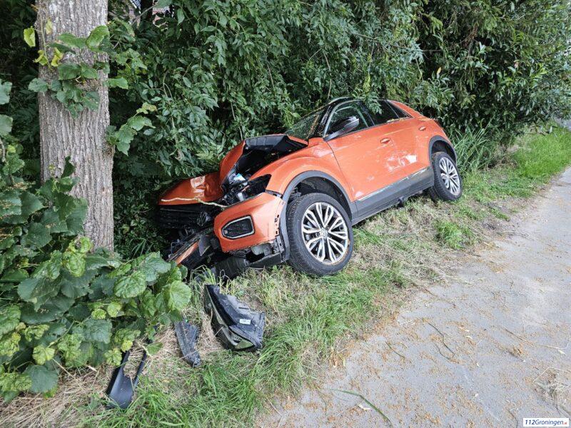 Auto belandt via greppel tegen boom op de Dellenweg bij Wagenborgen