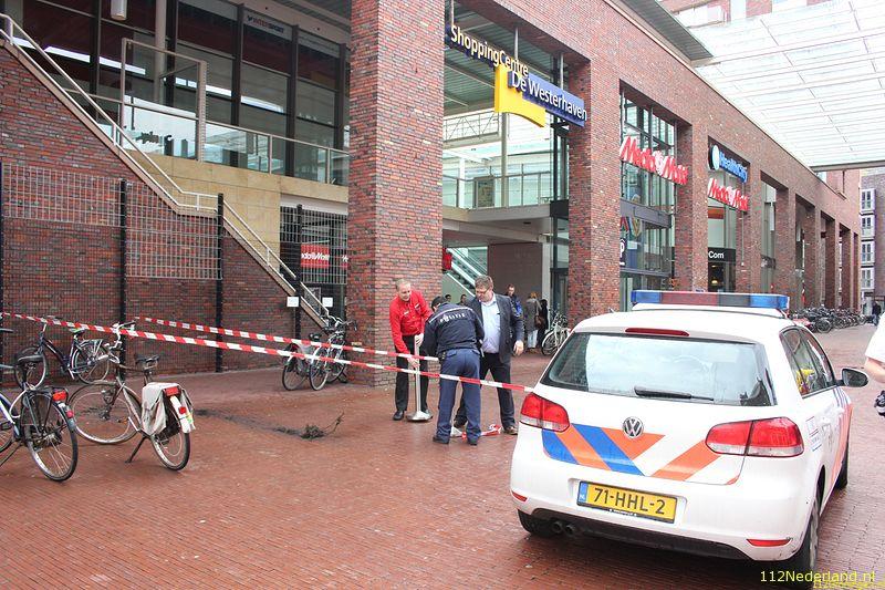 Bij de Mediamarkt aan de Westerhaven in Groningen is maandagmiddag brand gesticht tegen de gevel