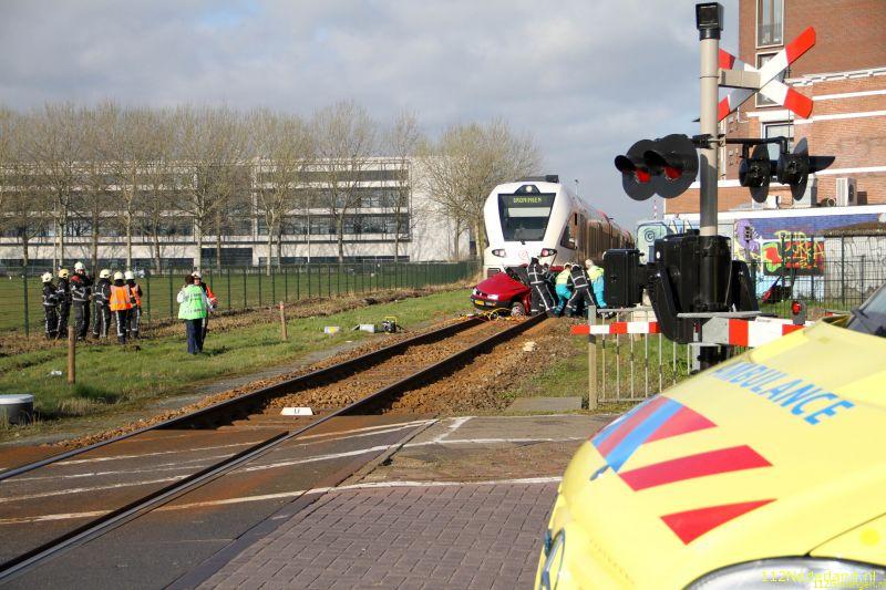 Op de spoorovergang van de Oostergoweg is vrijdagochtend een auto geramd door een trein. De