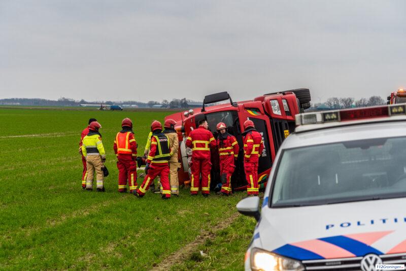 Vrachtwagen op de kant bij de Reidewolderpolder, chauffeur gewond
