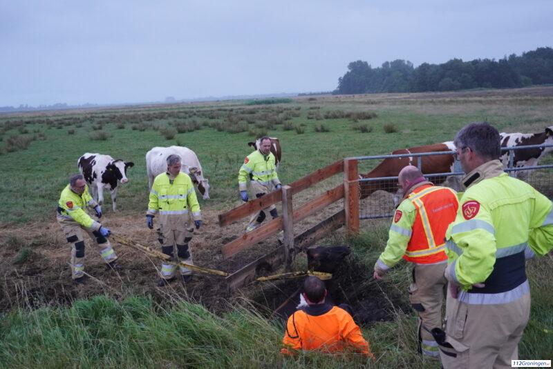 Koe raakt in sloot bij Onnen, brandweer schiet te hulp
