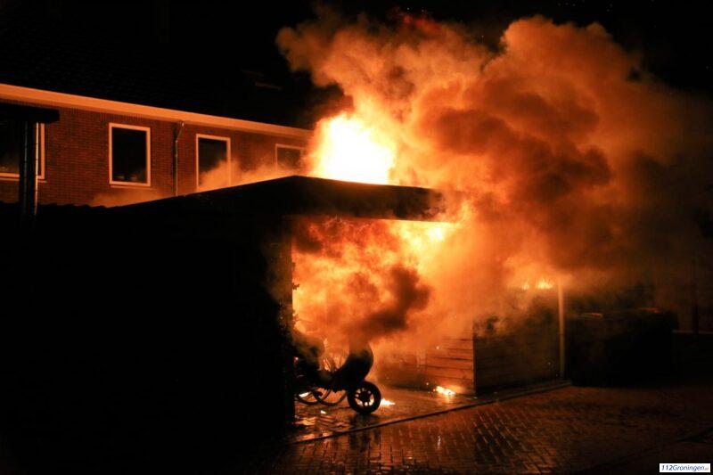 Felle uitslaande brand verwoest schuur met carport in Veendam