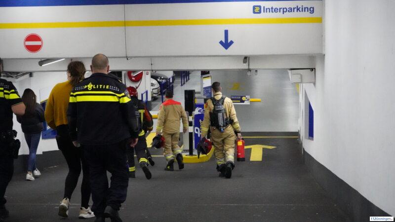 Autobrand in een parkeergarage onder Pathé in Groningen