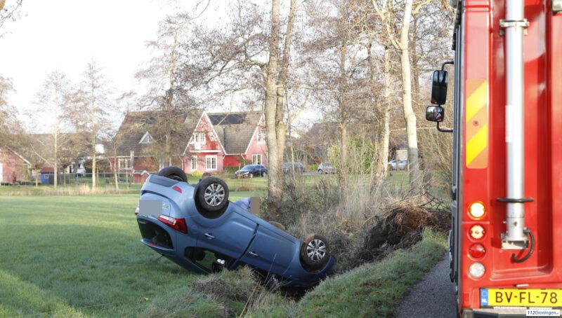 Auto belandt in de sloot bij Den Horn, vermoedelijk door gladheid (video)