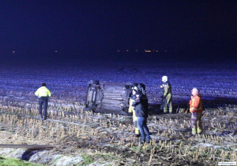 Automobilist belandt op z’n zijkant op akker in Gieten