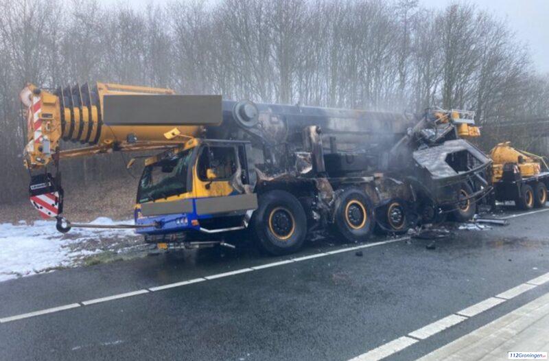 Frieschepalen – Op de A7 nabij Frieschepalen stond donderdagmorgen een kraanwagen in brand, dit na