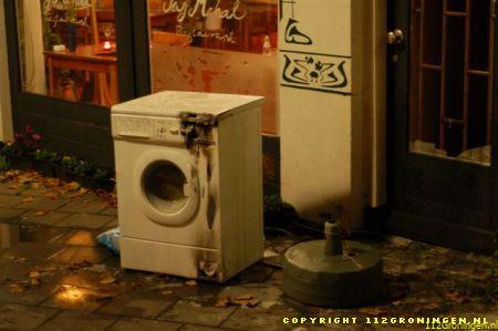 Bij een pakhuis aan de Veemarktstraat in Groningen is zondagavond een wasmachine in de brand