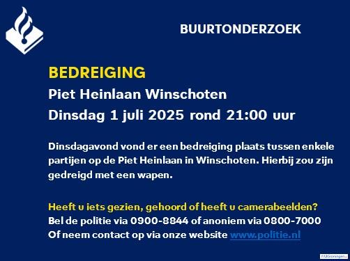 Winschoten – Een bedreiging dinsdagavond 1 juli rond 21:00 uur op de Piet Heinlaan in