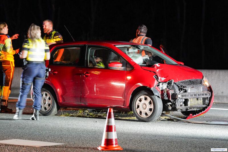 Auto botst tegen bord en eindigt op A28 De Punt, omstanders helpen