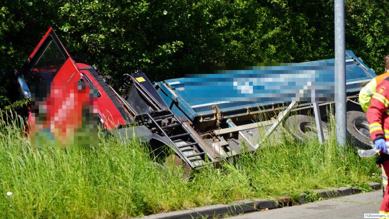 Ernstig eenzijdig ongeval; Vrachtwagen belandt in sloot bij Kattegat